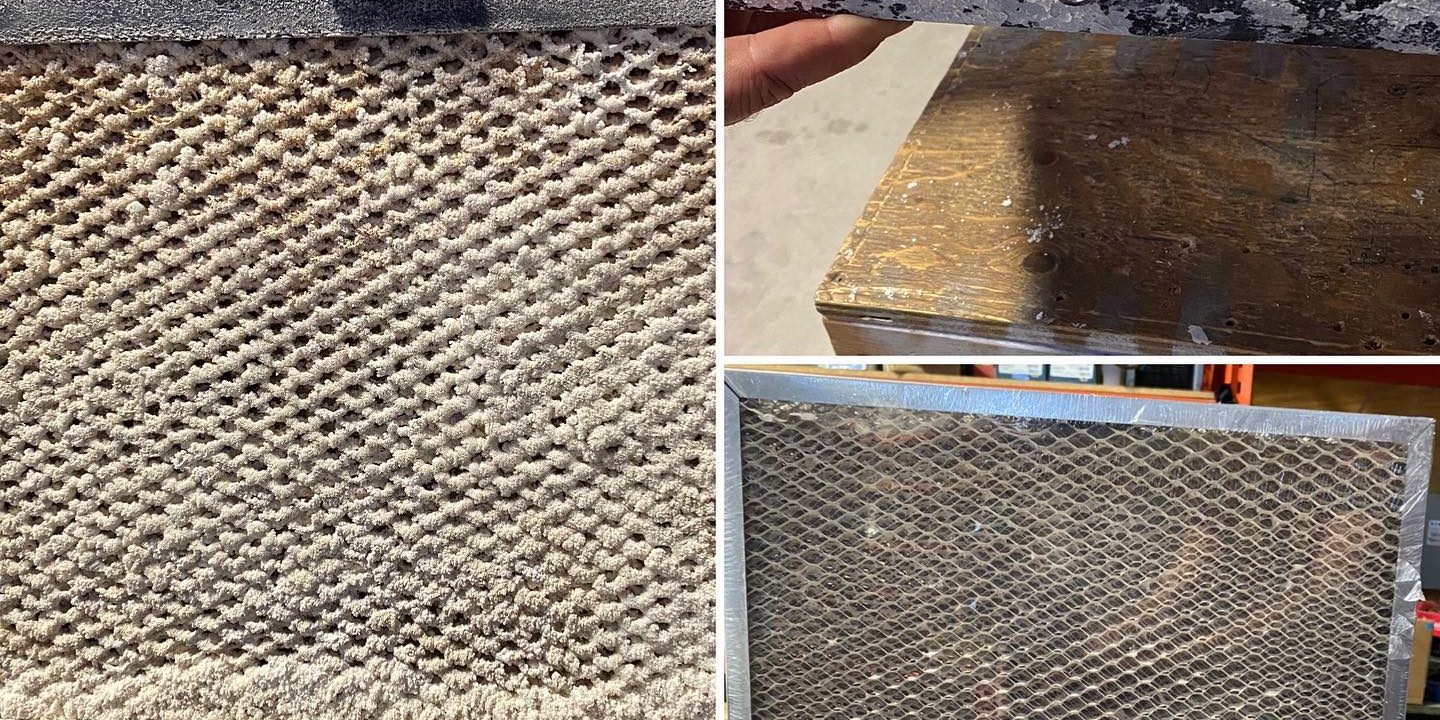 Humidifier pad that was not changed for two seasons. Plugged solid with calcium build up. We can’t stress enough how important it is to, maintain and change filters on your HVAC system. Bottom right photo is what a new humidifier pad looks like.